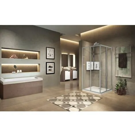Description Pour installation en angle. Composé d’une porte coulissante et d’une partie fixe. Profilés aluminium. Verre transparent 4 mm traité anti-calcaire. Système coulissant silencieux sur roulettes à billes. Réversible. Pour réaliser un angle complet, commander 2 côtés.